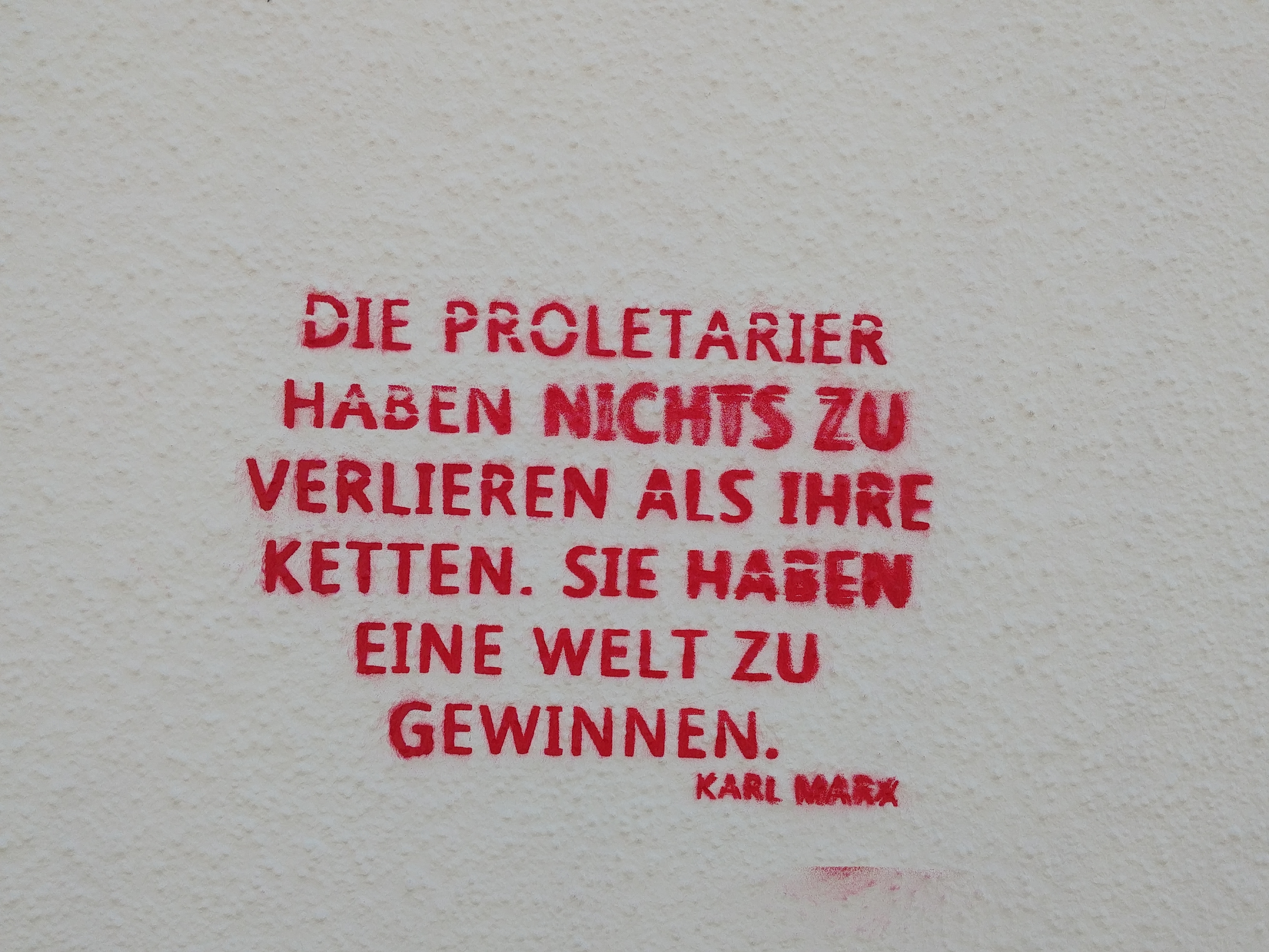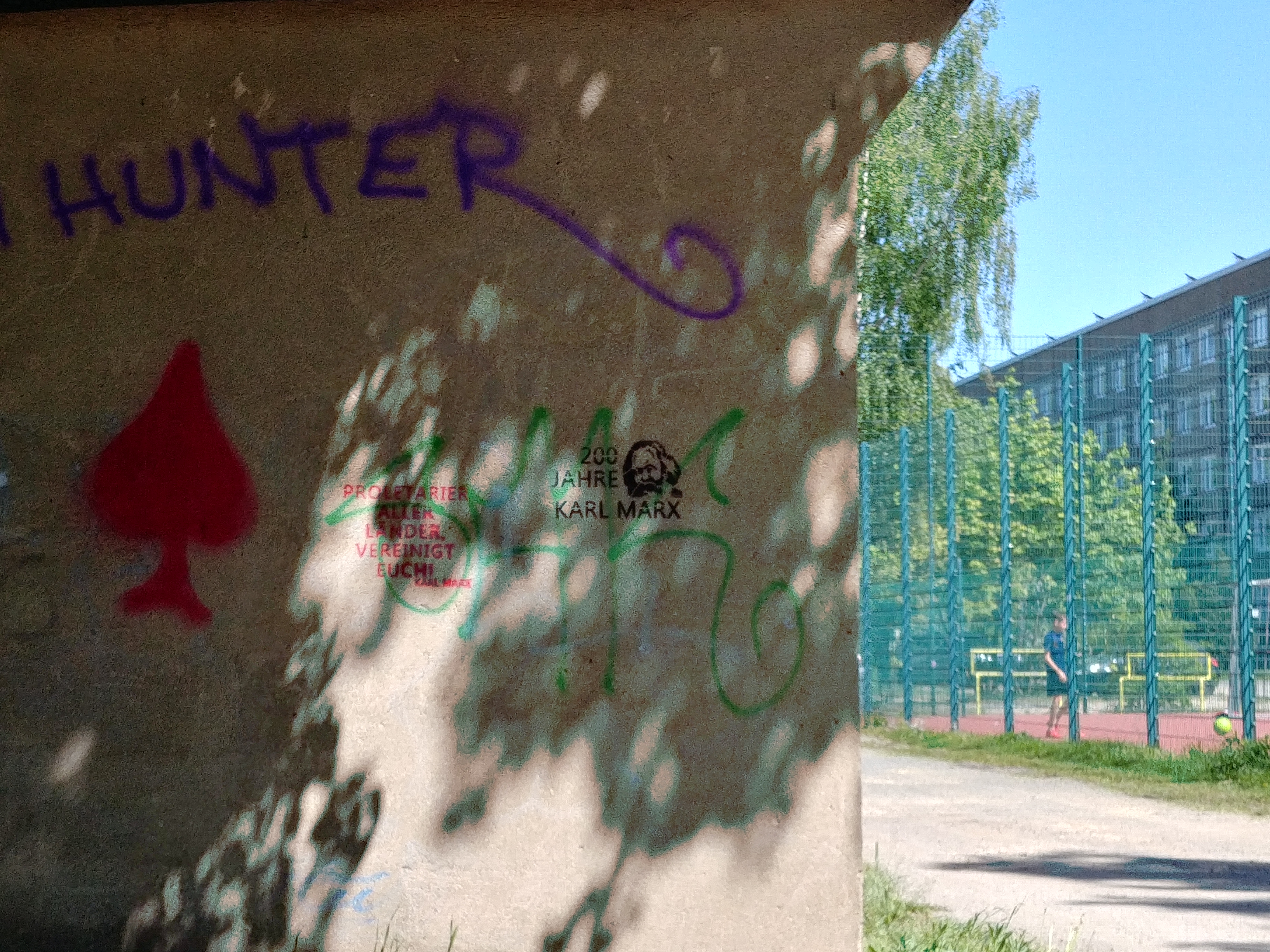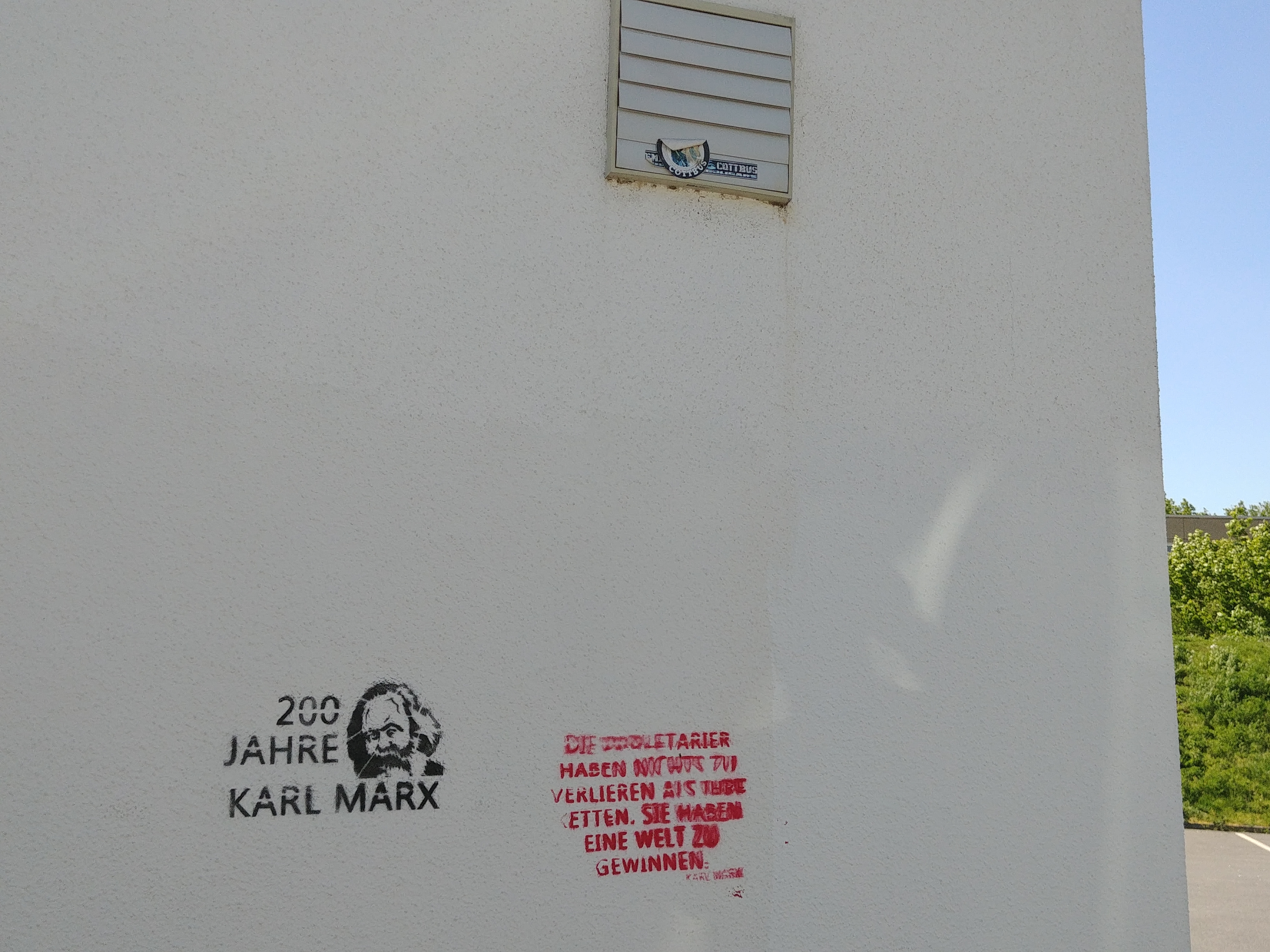 Anlässlich von Karl Marx‘ 200. Geburtstag sind in Cottbus einige Dutzend Sprayereien mit den bekanntesten seiner Zitate in einem Arbeiterstadtteil aufgetaucht.
